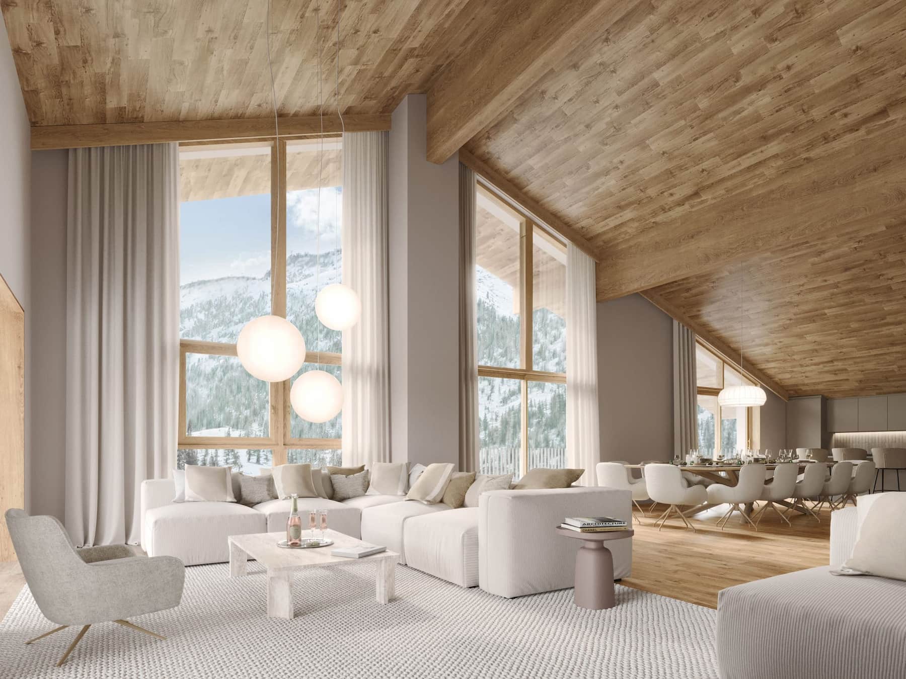 Ici, la pierre sublime les espaces. Le contraste avec les matériaux duveteux, nous donne envie de nous blottir dans ce refuge sécurisant et apaisant. L’élégance des matériaux, les jeux de matières et l’ambiance naturelle révèlent le luxe discret et le charme de l’art de vivre alpin.